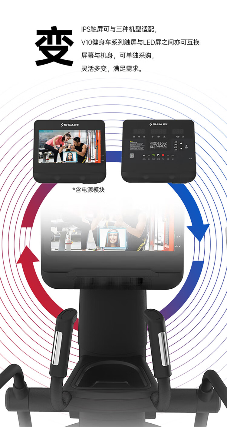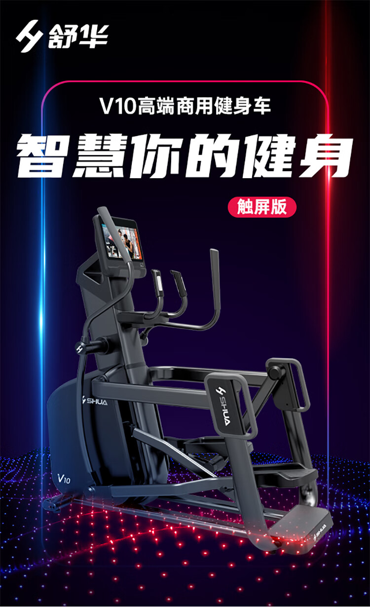 舒華立式商用健身車SH-B9100U(V10)觸屏版擁有超大顯示和操作屏幕, 可以任意設(shè)置阻力、時(shí)間和距離等參數(shù),還可以即時(shí)顯示心跳和轉(zhuǎn)速等數(shù)據(jù),同時(shí),SH-B9100U提供多項(xiàng)科學(xué)運(yùn)動(dòng)處方,更輕松掌握運(yùn)動(dòng)節(jié)奏。