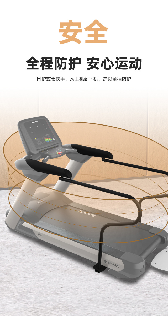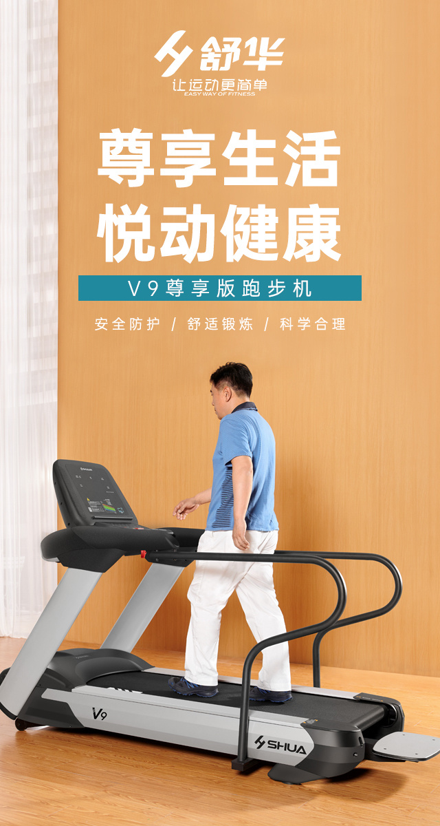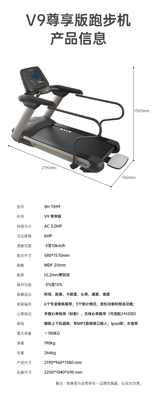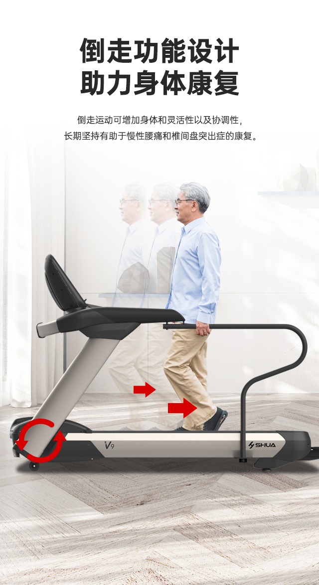 舒華V9尊享版跑步機(jī)SH-T899設(shè)有輔助上下機(jī)踏板的驅(qū)動(dòng)踏板,控制速度在-5至10km/h內(nèi)可調(diào),坡度也可在-3至15%內(nèi)可調(diào),跑臺(tái)尺寸是580×1570mm,持續(xù)馬力是AC 3.0HP。
