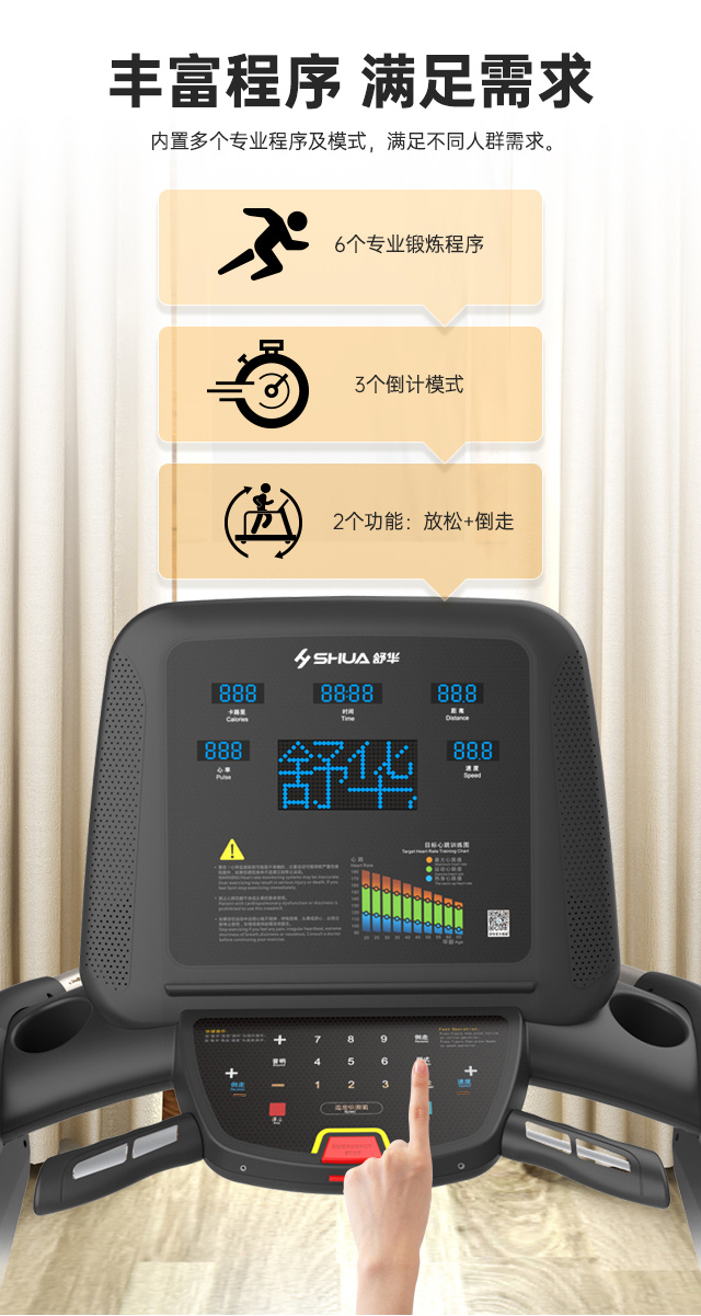 舒華多功能跑步機(jī)T56 SH-T5600-T2跑臺(tái)尺寸是480×1200mm,持續(xù)馬力是DC 1.5CHP(無(wú)刷電機(jī))。