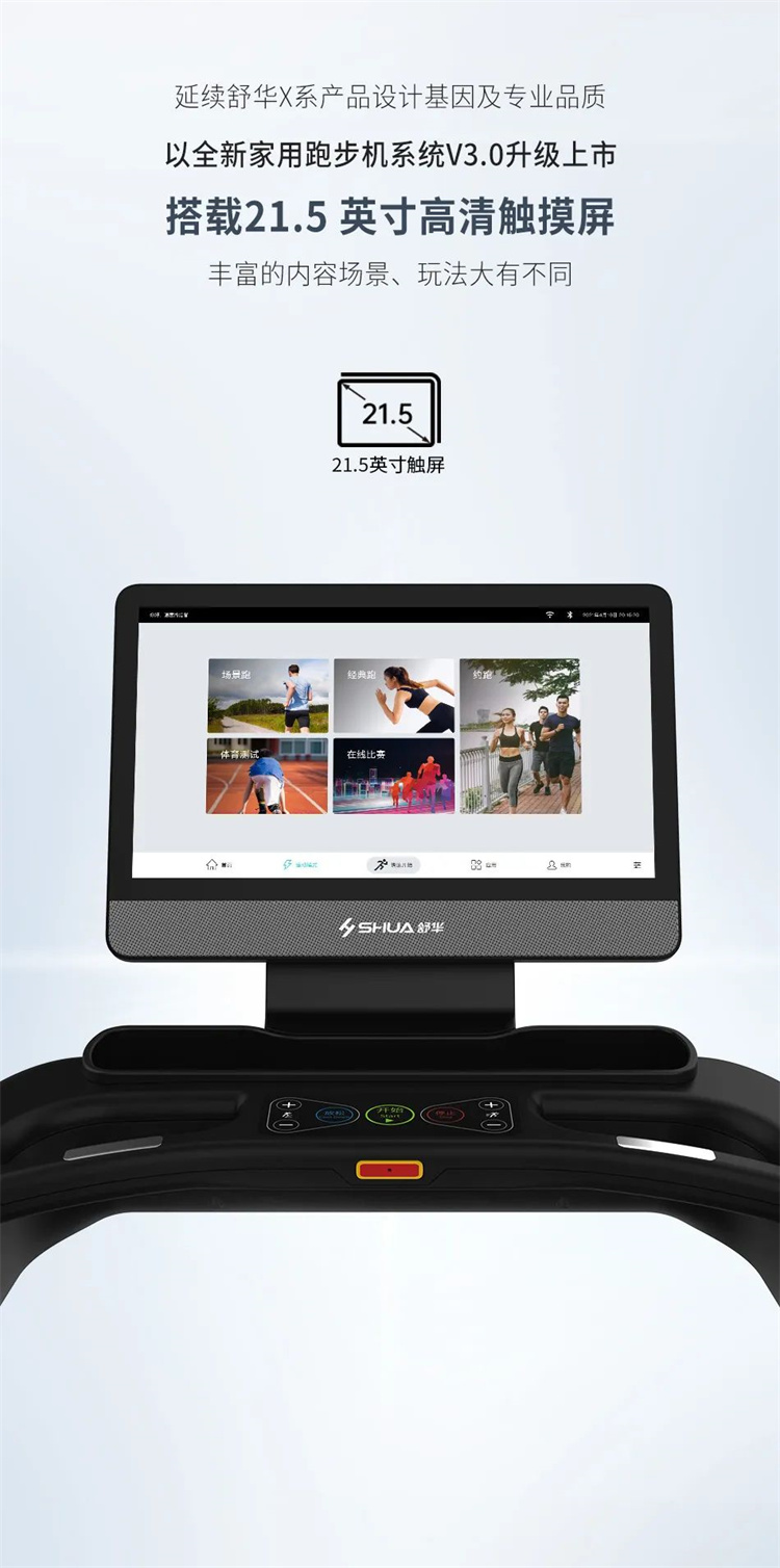 舒華X5 Pro豪華智能跑步機采用全新舒華跑步機系統(tǒng),搭載21.5寸大屏,內(nèi)置九種運動程序,包括場景跑、在線約跑和一鍵體育考試等內(nèi)容,亦有教練在線科學(xué)指導(dǎo)和比賽互動,可在線升級,歷經(jīng)耐久性測試,讓您使用更安全,雙跑臺設(shè)計,全減震系統(tǒng),核心動力采用F級耐高溫馬達,5.0HP峰值馬力,提供源源動力,讓您享受每一次暢跑體驗。